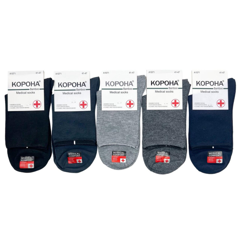 Чоловічі бамбукові медичні шкарпетки без резинки Корона 10 пар — Чоловічі шкарпетки з м'яким манжетом без тугої гумки. Колір: Мікс кольорів. Склад: Бамбук 90%, Еластан 5%. Виробник: Корона.