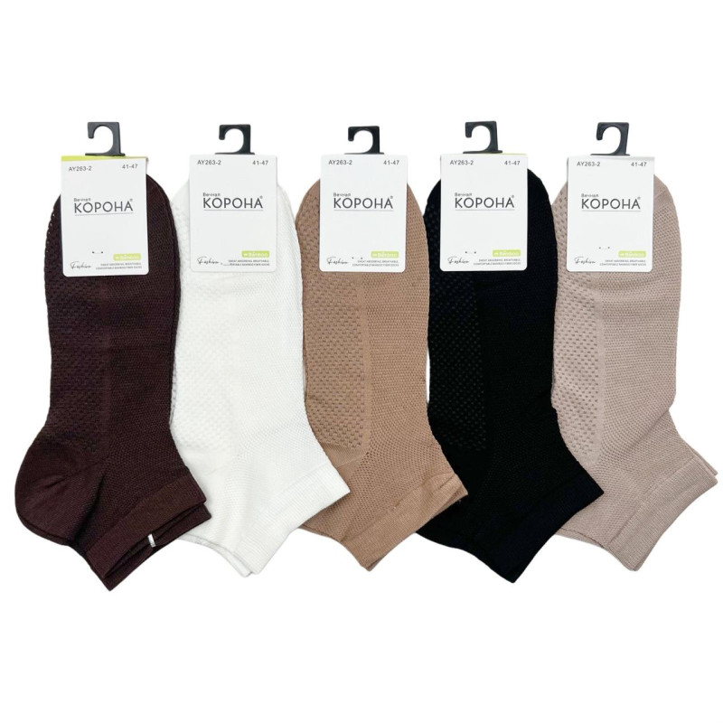 Чоловічі короткі бамбукові шкарпетки з сіткою Корона — Чоловічі шкарпетки з бамбукового волокна. Колір: Мікс кольорів. Склад: Бамбук 90%, Поліестер 5%, Еластан 5%. Виробник: Корона.
