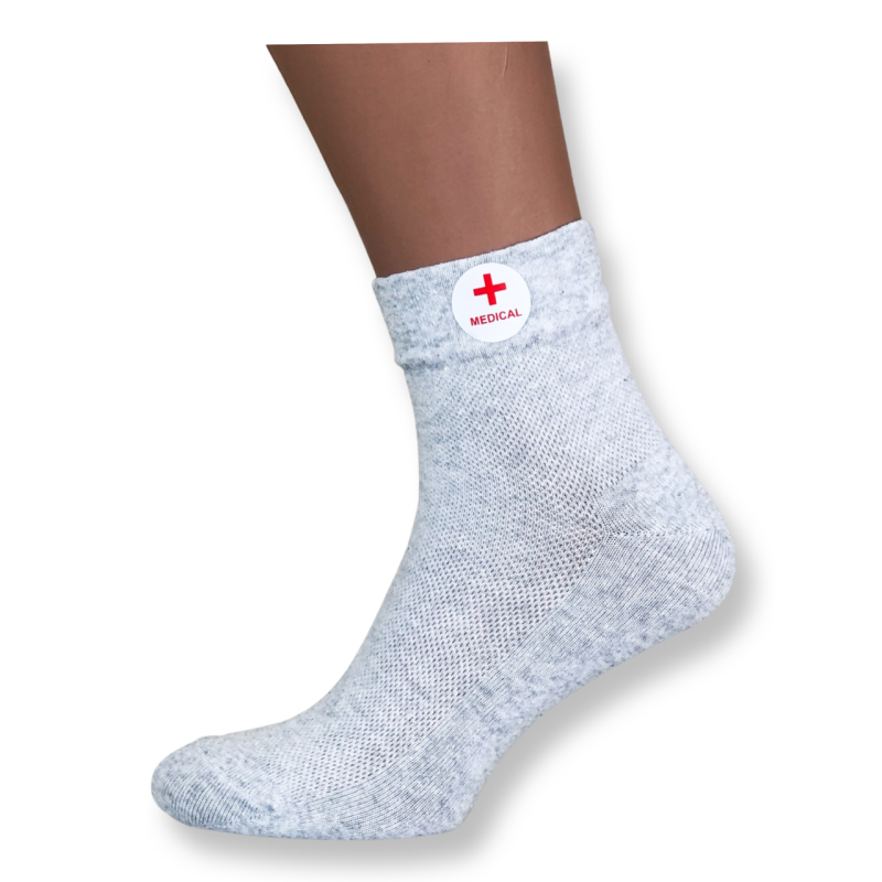 Чоловічі літні медичні шкарпетки з сіткою без гумки Krokus — українська модель світло-сірого кольору. Широкий манжет без гумки не стискає ногу, запобігає набрякам і скручуванню краю. Сіточка забезпечує додатковий доступ повітря. Продаються упаковками по 12 пар.