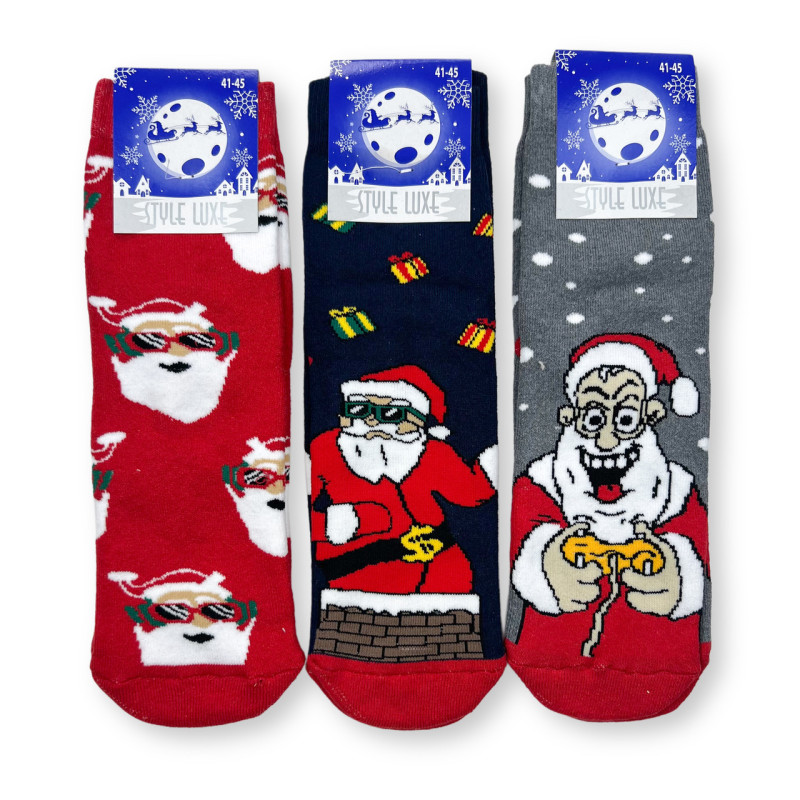 Чоловічі новорічні махрові шкарпетки Санта подарунки Style Luxe — Чоловічі шкарпетки з тематичними малюнками до зимових свят. Колір: Мікс кольорів. Склад: Бавовна 85%, Поліестер 11%, Еластан 4%. Виробник: STYLE LUXE.