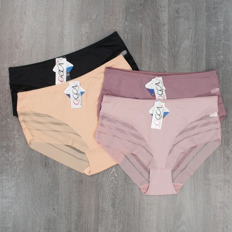 Гладкі безшовні труси сліпи з декоративною прозорою сіточкою (великі розміри) Occa 4XL — Жіночі труси для повного комфорту у збільшених розмірах. Колір: Мікс кольорів. Склад: Поліамід 88%, Еластан 12%. Виробник: Occa.