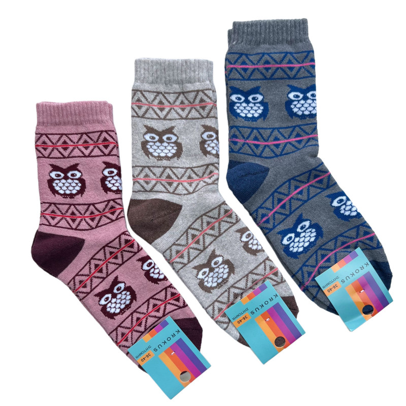 Махрові жіночі високі шкарпетки з совами Krokus — Жіночі шкарпетки для носіння в холодну пору року. Колір: Мікс кольорів. Склад: Бавовна 80%, Поліамід 18%, Еластан 2%. Виробник: KROKUS.