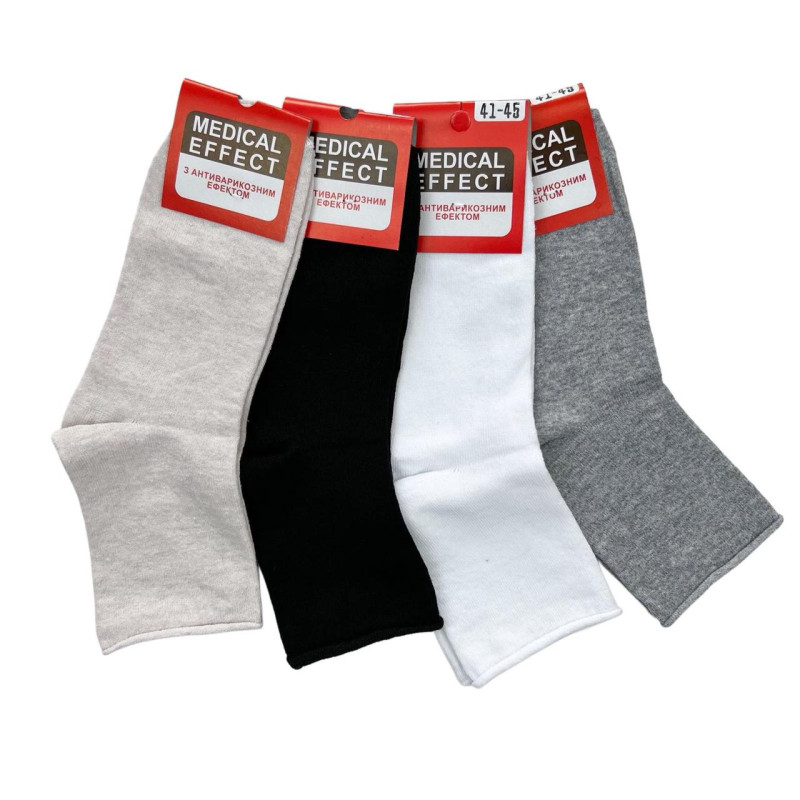 Медичні чоловічі шкарпетки без резинки бавовна Medical Effect — Чоловічі шкарпетки з м'яким манжетом без тугої гумки. Колір: Мікс кольорів. Склад: Бавовна 90%, Еластан 10%. Виробник: Без бренду.