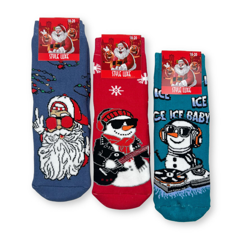Набір дитячих новорічних махрових шкарпеток 3 пари (санта + сніговики) Style Luxe 18-20 — Дитячі шкарпетки для носіння в холодну пору року. Колір: Мікс кольорів. Склад: Бавовна 85%, Поліестер 11%, Еластан 4%. Виробник: STYLE LUXE.