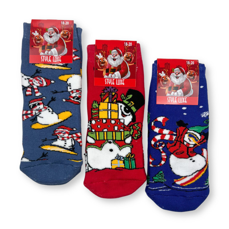 Набір дитячих новорічних махрових шкарпеток 3 пари (сніговики) Style Luxe 18-20 — Дитячі шкарпетки для носіння в холодну пору року. Колір: Мікс кольорів. Склад: Бавовна 85%, Поліестер 11%, Еластан 4%. Виробник: STYLE LUXE.