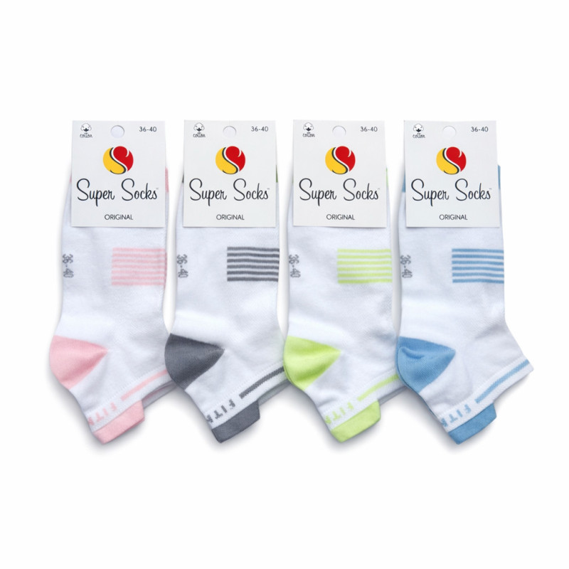 Набір коротких жіночих спортивних шкарпеток білого кольору з сіточкою 4 пари Super Socks — Жіночі шкарпетки для щоденного носіння. Колір: Білий. Склад: Бавовна 75%, Поліамід 23%, Еластан 2%. Виробник: Super Socks.