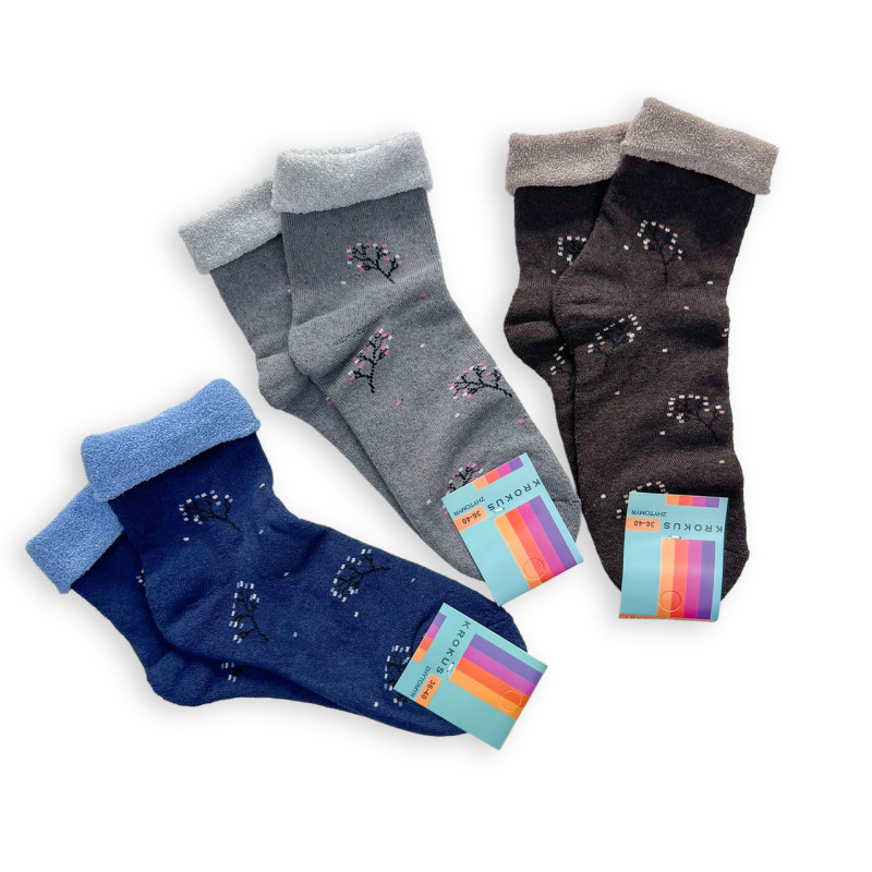 Набір жіночих махрових шкарпеток з ослабленою резинкою 3 пари Krokus — Жіночі шкарпетки для носіння протягом усього дня. Колір: Мікс кольорів. Склад: Бавовна 80%, Поліамід 18%, Еластан 2%. Виробник: KROKUS.