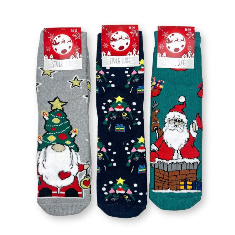 Набір жіночих новорічних махрових шкарпеток 3 пари Style Luxe — Жіночі шкарпетки з тематичними малюнками до зимових свят. Колір: Мікс кольорів. Склад: Бавовна 85%, Поліестер 11%, Еластан 4%. Виробник: STYLE LUXE.