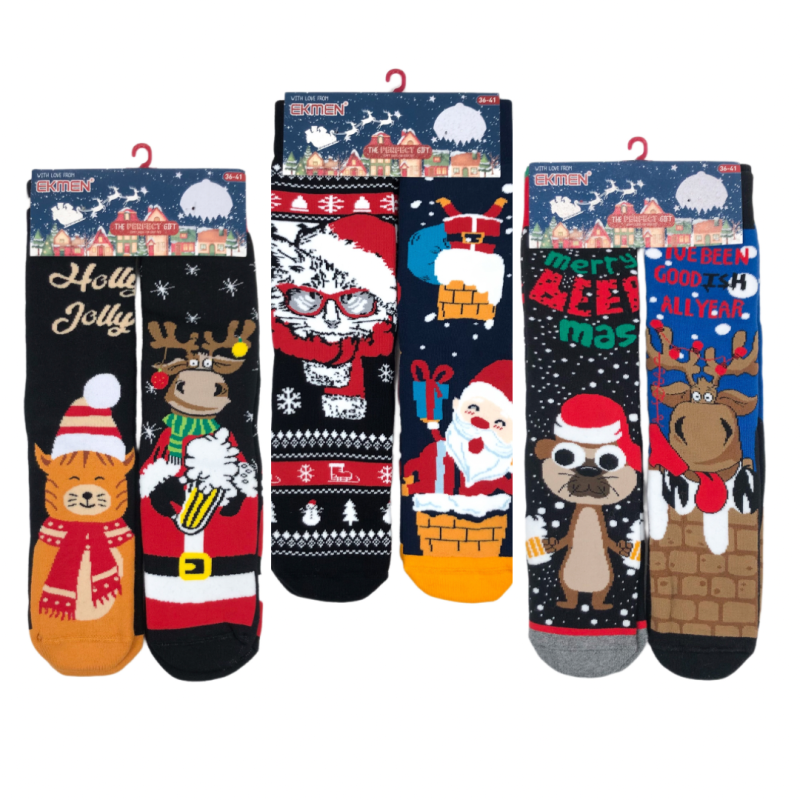 Новорічні жіночі махрові шкарпетки Ekmen (комплект 2 пари) Кіт+Санта — Жіночі шкарпетки з тематичними малюнками до зимових свят. Колір: Мікс кольорів. Склад: Бавовна 80%, Поліамід 20%, Еластан 3%. Виробник: EKMEN.
