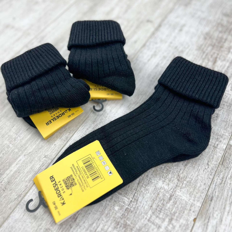 Шкарпетки жіночі з відворотом з вовни чорні Kardesler — Жіночі шкарпетки для носіння в холодну пору року. Колір: Чорний. Склад: Вовна 80%, Поліамід 17%, Еластан 3%. Виробник: Kardesler Socks.