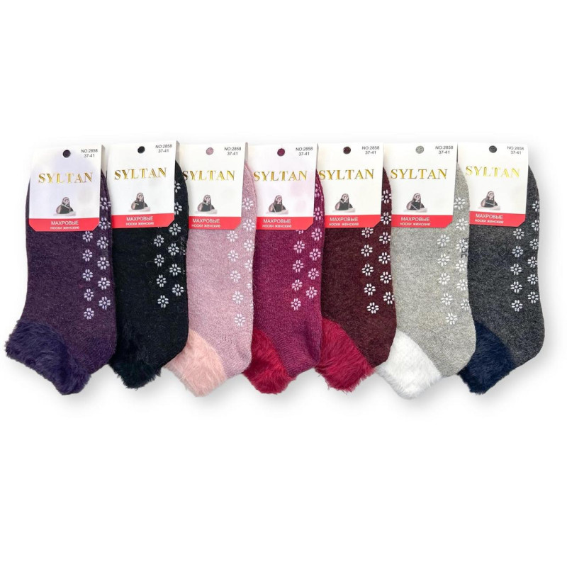 Жіночі ангорові махрові короткі шкарпетки тапочки з тормозами Syltan — Жіночі шкарпетки для носіння в холодну пору року. Колір: Мікс кольорів. Склад: Ангора 50%, Соболь 35%, Поліамід 15%. Виробник: Syltan.