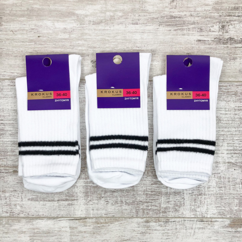 Жіночі білі високі шкарпетки зі смужками на манжеті Krokus — Жіночі шкарпетки для щоденного носіння. Колір: Білий. Склад: Бавовна 80%, Поліамід 18%, Еластан 2%. Виробник: KROKUS.