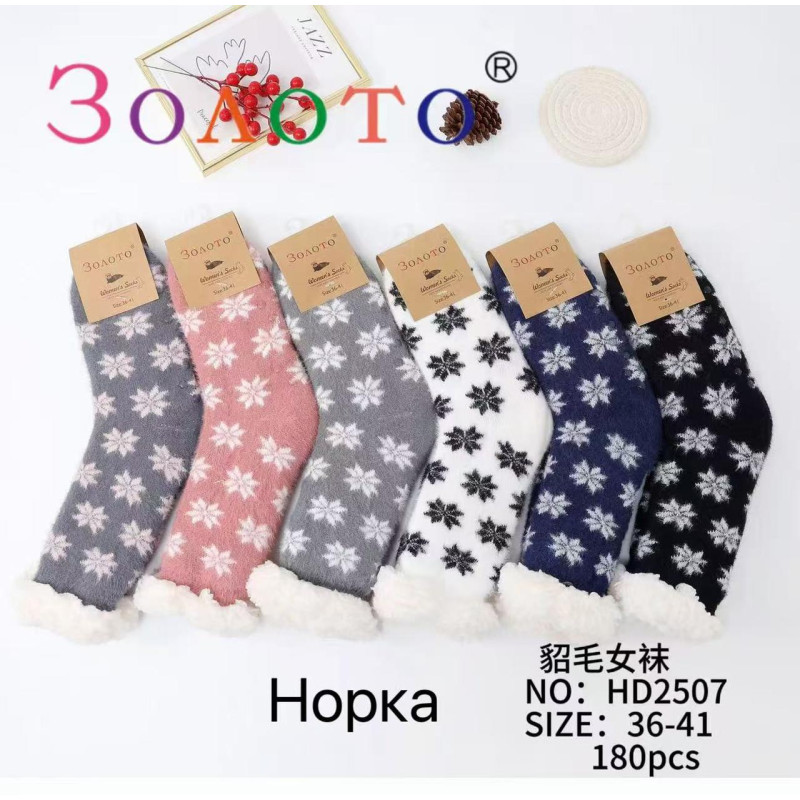 Жіночі норкові домашні шкарпетки на хутрі з гальмами сніжинка Золото — Жіночі шкарпетки для носіння в холодну пору року. Колір: Мікс кольорів. Склад: Акрил 75%, Поліестер 25%. Виробник: Золото.