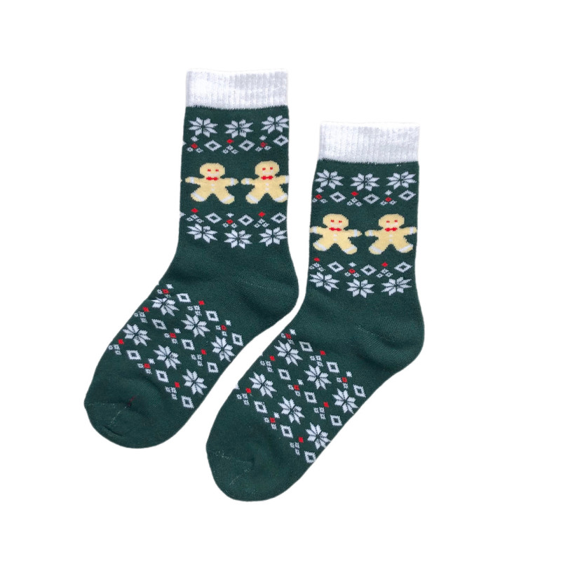 Жіночі новорічні махрові шкарпетки пряники (зелений) — Жіночі шкарпетки з тематичними малюнками до зимових свят. Колір: Зелений. Склад: Бавовна 70%, Поліестер 26%, Еластан 4%. Виробник:.