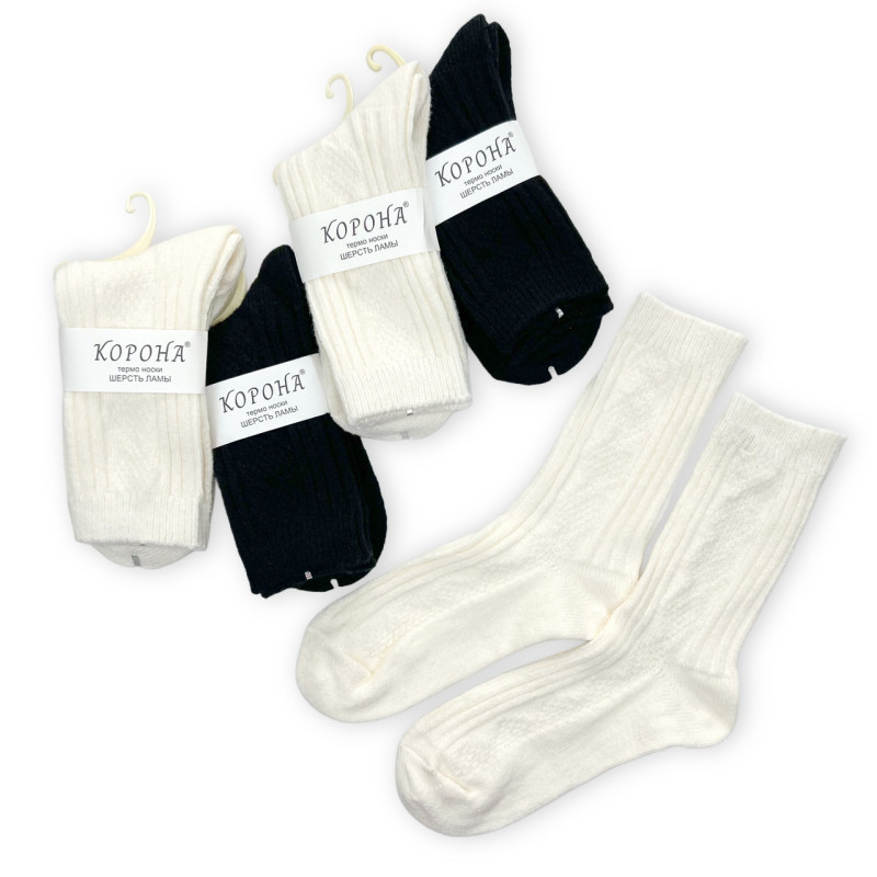 Жіночі теплі шкарпетки вовна лами асорті Корона Чорний — Жіночі шкарпетки для носіння в холодну пору року. Колір: Чорний. Склад: Вовна Лами 85%, Поліамід 10%, Еластан 5%. Виробник: Корона.